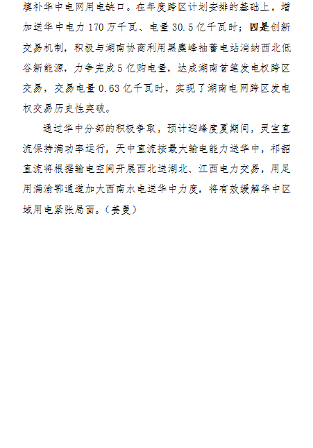 通過(guò)華中分部的積極爭(zhēng)取,預(yù)計(jì)迎峰度夏期間,靈寶直流保持滿(mǎn)功率運(yùn)行,天中直流按最大輸電能力送華中,祁韶直流將根據(jù)輸電空間開(kāi)展西北送湖北、江西電力交易,用足用滿(mǎn)渝鄂通道加大西南水電送華中力度,將有效緩解華中區(qū)域用電緊張局面。