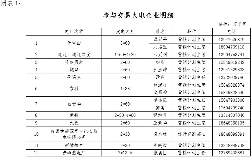 一、售電方:蒙東地區(qū)符合有關(guān)文件規(guī)定的火電企業(yè),名單詳見(jiàn)附表1。