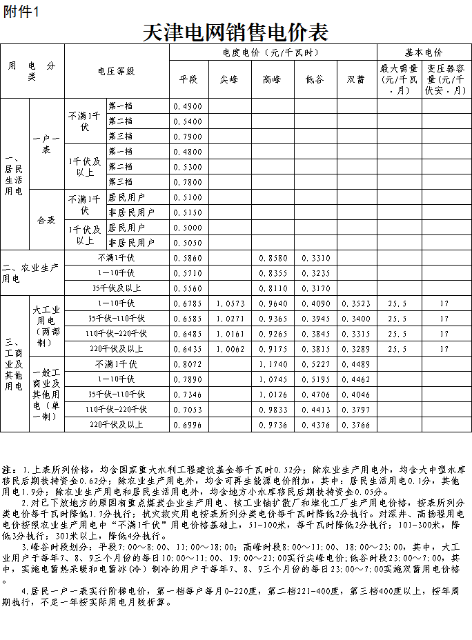 二、自2018年5月1日起,我市一般工商業(yè)及其他用電銷售價(jià)格平均每千瓦時(shí)降低1.85分錢;同步等額降低天津電網(wǎng)2017-2019年監(jiān)管期一般工商業(yè)及其他輸配電價(jià)水平。調(diào)整后的天津電網(wǎng)銷售電價(jià)表和天津電網(wǎng)2017-2019年輸配電價(jià)表見附件。