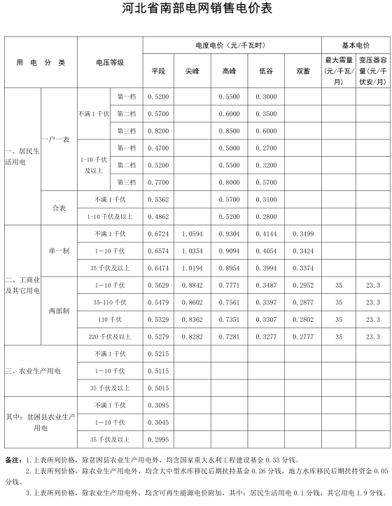 附件:1.河北省南部電網(wǎng)銷售電價(jià)表