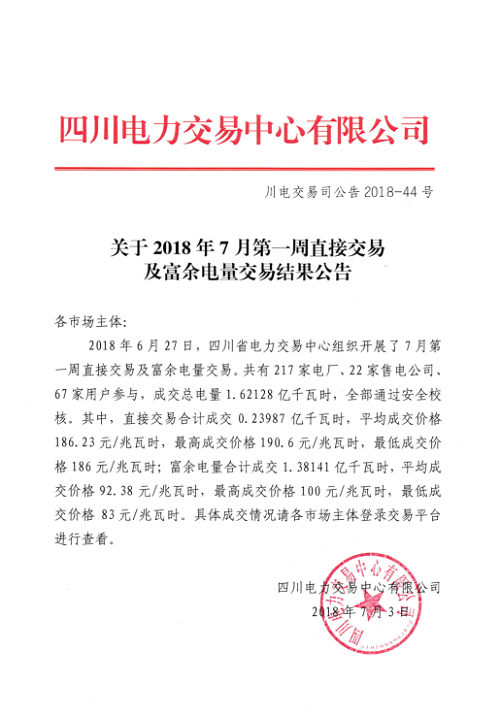 四川電力交易中心日前發(fā)布了《關(guān)于2018年7月第一周直接交易及富余電量交易結(jié)果公告》,共有217家電廠、22家售電公司、67家用戶參與,成交總電量1.62128億千瓦時,全部通過安全校核。詳情如下: