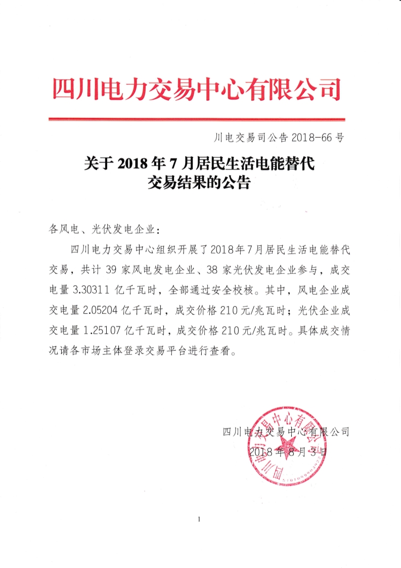 關(guān)于2018年7月居民生活電能替代交易結(jié)果的公告