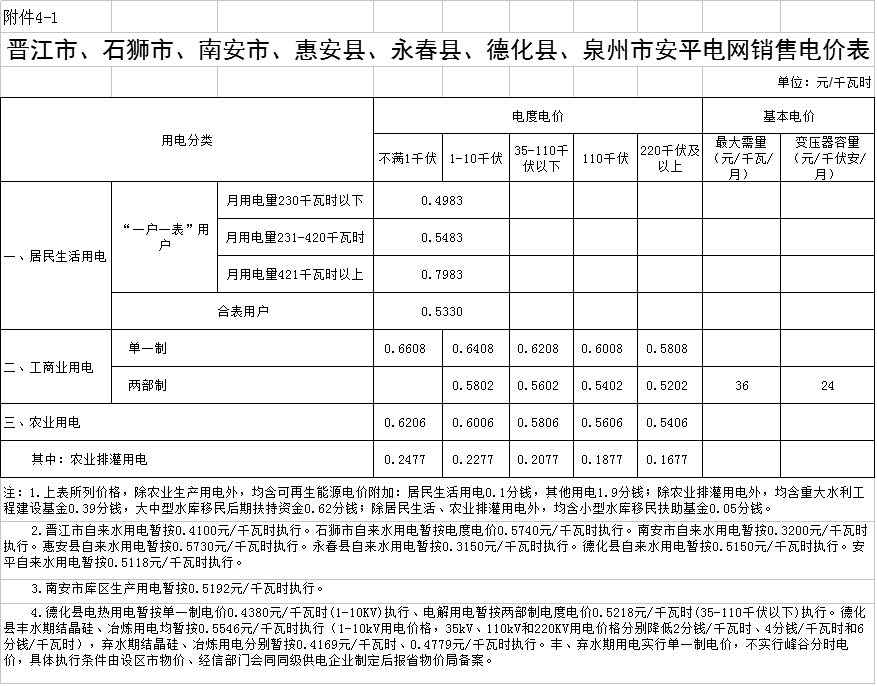 4.泉州市各縣級(jí)電網(wǎng)銷(xiāo)售電價(jià)表