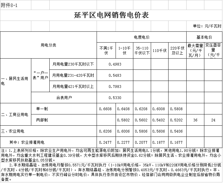 8.南平市各縣級(jí)電網(wǎng)銷(xiāo)售電價(jià)表
