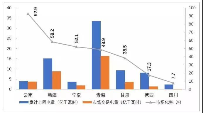 光伏發(fā)電市場(chǎng)化率居前幾位的省份依序?yàn)椋涸颇?92.9%)、新疆(58.2%)、寧夏(52.1%)、青海(48.9%)。