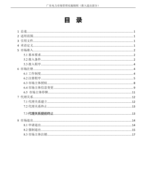 6 .1 工作制度電力交易機構(gòu)建立《廣東電力市場售電公司準入退出規(guī)范指引》、《廣東電力市場發(fā)電企業(yè)注冊規(guī)范指引》、《廣東電力市場電力用戶注冊規(guī)范指引》等市場注冊管理工作制度,報省級政府主管部門和能源監(jiān)管機構(gòu)備案。