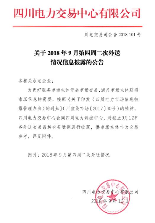 四川電力交易中心日前發(fā)布了《關(guān)于2018年9月第四周二次外送情況信息披露的公告》,對(duì)截止9月12日各外送交易品種有關(guān)數(shù)據(jù)進(jìn)行披露,其中四川送浙江(賓金)月計(jì)劃最高,為10億千瓦時(shí)。
