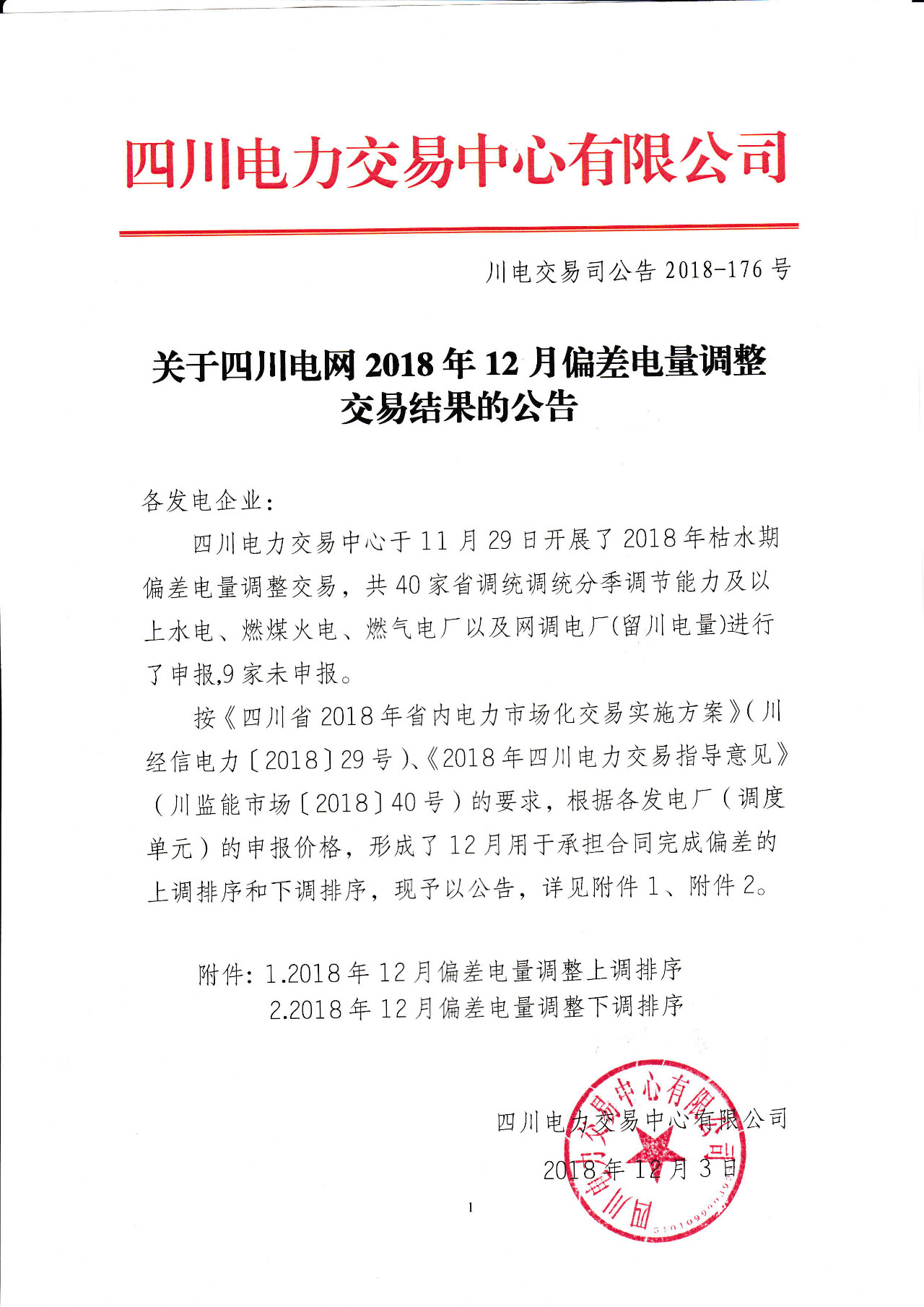 據(jù)悉,四川電力交易中心日前發(fā)布了《關(guān)于四川電網(wǎng)2018年12月偏差電量調(diào)整交易結(jié)果的公告》,40家電廠申報,9家未申報。