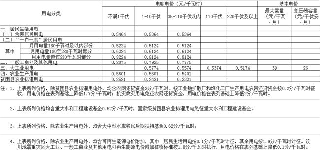 一、四川電網(wǎng)(含2016年及以后新改制供電公司)一般工商業(yè)及其他用電目錄銷售電價每千瓦時下調0.85分錢,一般工商業(yè)及其他用電輸配電價和躉售工商業(yè)電價同步下調。四川電網(wǎng)供區(qū)內(nèi)現(xiàn)行一般工商業(yè)及其他用電價格低于本通知公布的四川電網(wǎng)目錄銷售電價的,銷售電價水平暫維持不變。