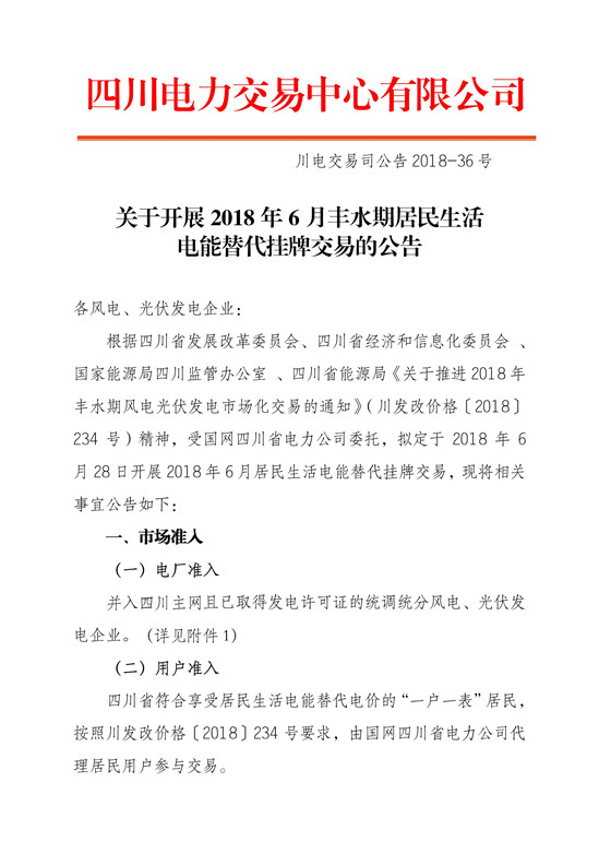 四川開展2018年6月豐水期居民生活電能替代掛牌交易:電量需求3.87萬兆瓦時