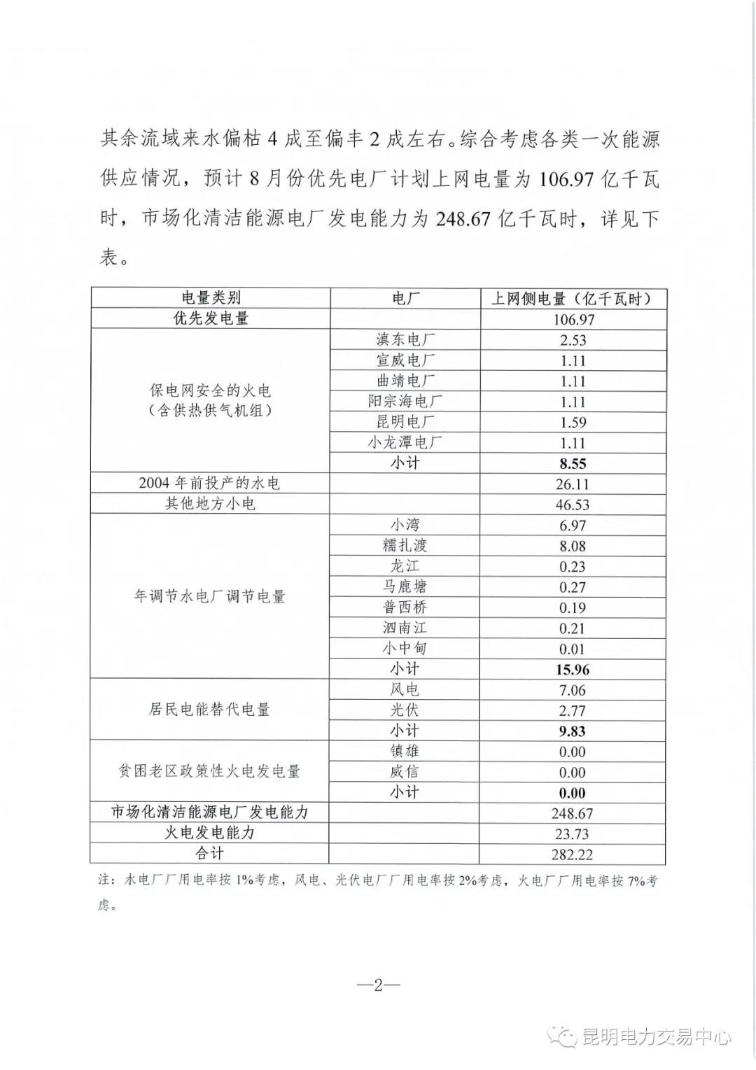 云南2018年8月電力市場化交易信息披露
