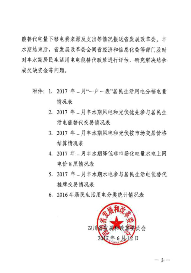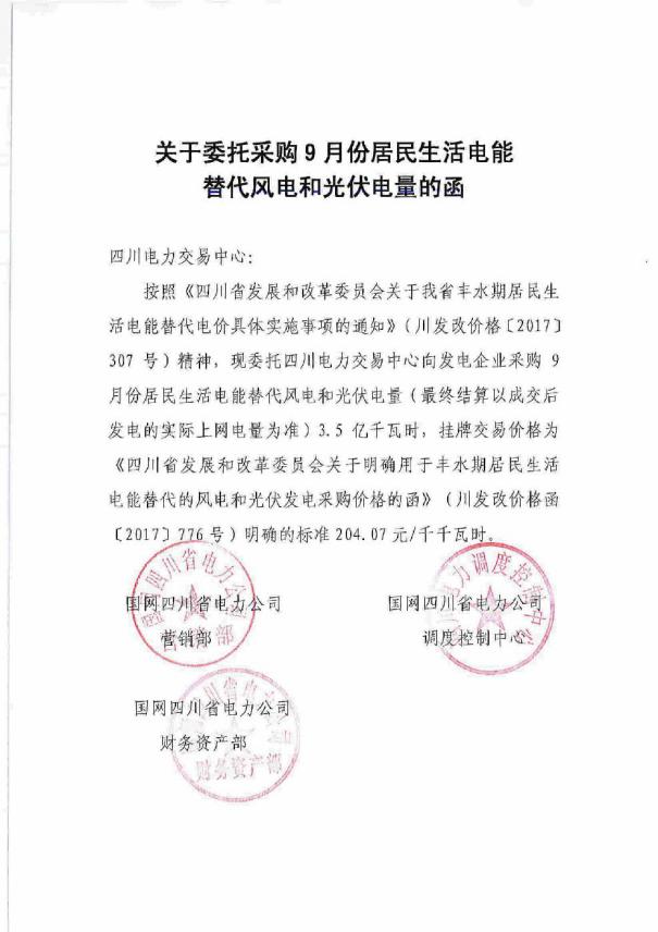 根據(jù)《四川省發(fā)展和改革委員會(huì)關(guān)于我省豐水期居民生活電能替代電價(jià)具體實(shí)施事項(xiàng)的通知》(川發(fā)改價(jià)格【2017】307號(hào))、《四川省發(fā)展和改革委員會(huì)關(guān)于明確用于豐水期居民生活電能替代的風(fēng)電和光伏發(fā)電采購(gòu)價(jià)格的函