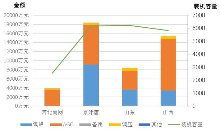 圖 7 華北區(qū)域分省(地區(qū))電力輔助服務(wù)補(bǔ)償分項(xiàng)費(fèi)用情況