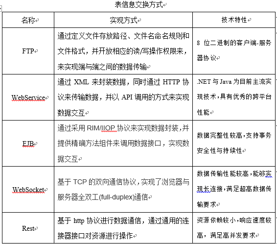FTP協(xié)議交換的信息為公開共享信息,信息交換的方向為單向,實現(xiàn)簡單、傳輸批量數(shù)據(jù)效率較高;WebService遵守具體的技術(shù)規(guī)范,能與其它兼容的組件進行互操作,若增加數(shù)據(jù)量則會降低解釋程序的執(zhí)行效率;EJB基于規(guī)范的平臺,支持多種中間件技術(shù),對資源配置要求較高;WebSocket使用客戶/服務器模式,實現(xiàn)簡單、性能高,一旦連接上之后,就可以按設計的數(shù)據(jù)交換方法和格式進行數(shù)據(jù)傳輸,適合大批量數(shù)據(jù)傳輸;Rest基于HTTP協(xié)議,可利用緩存來提高響應速度,對資源依賴性較小,適合高并發(fā)傳輸訪問。