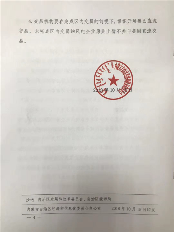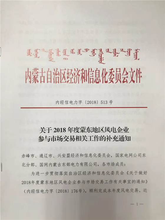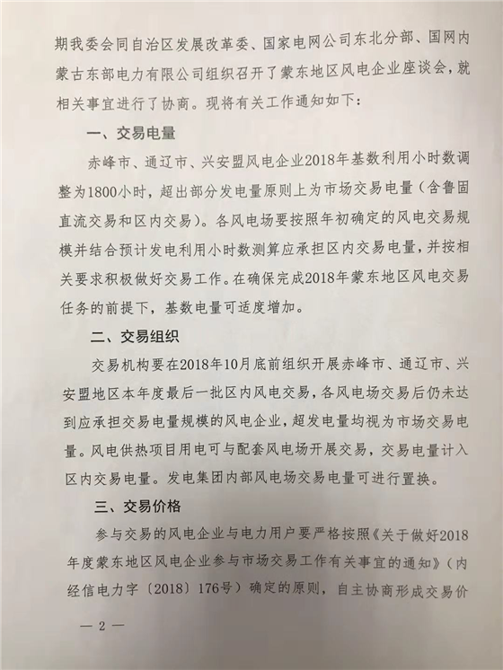 2018年蒙東地區(qū)風(fēng)電企業(yè)參與市場交易相關(guān)工作的補充通知:10月底前開展本年度最后一批區(qū)內(nèi)風(fēng)電交易
