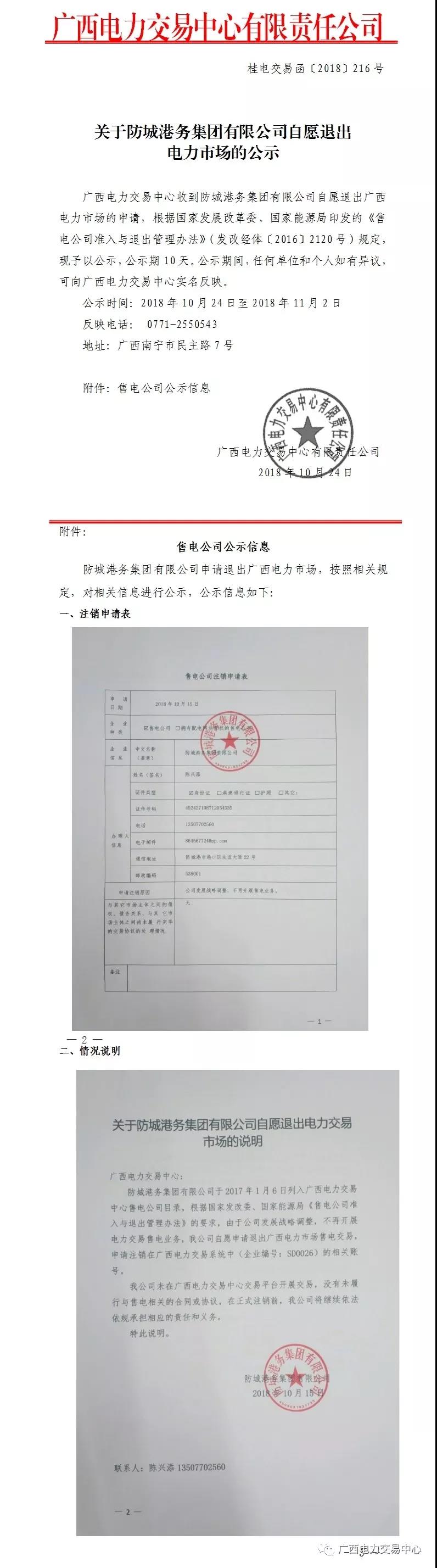 廣西關(guān)于防城港務(wù)集團(tuán)有限公司自愿退出電力市場(chǎng)的公示