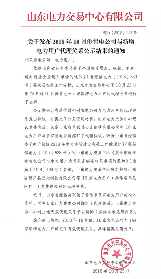 山東電力交易中心日前發(fā)布了《關(guān)于發(fā)布2018年10月份售電公司與新增電力用戶代理關(guān)系公示結(jié)果的通知》,山東電力交易中心于10月23日至24日對(duì)10月份售電公司與新增電力用戶的代理關(guān)系進(jìn)行了公示。公示期間,有單位對(duì)個(gè)別售電公司與電力用戶的代理關(guān)系提出異議,并提交了相關(guān)證明材料。山東電力交易中心經(jīng)認(rèn)真核實(shí)后,認(rèn)定山東省博興縣云光鋼鐵有限公司等10家電力用戶與多家售電公司簽訂了代理協(xié)議,決定解除山東省博興縣云光鋼鐵有限公司等10家電力用戶與售電公司的代理關(guān)系。