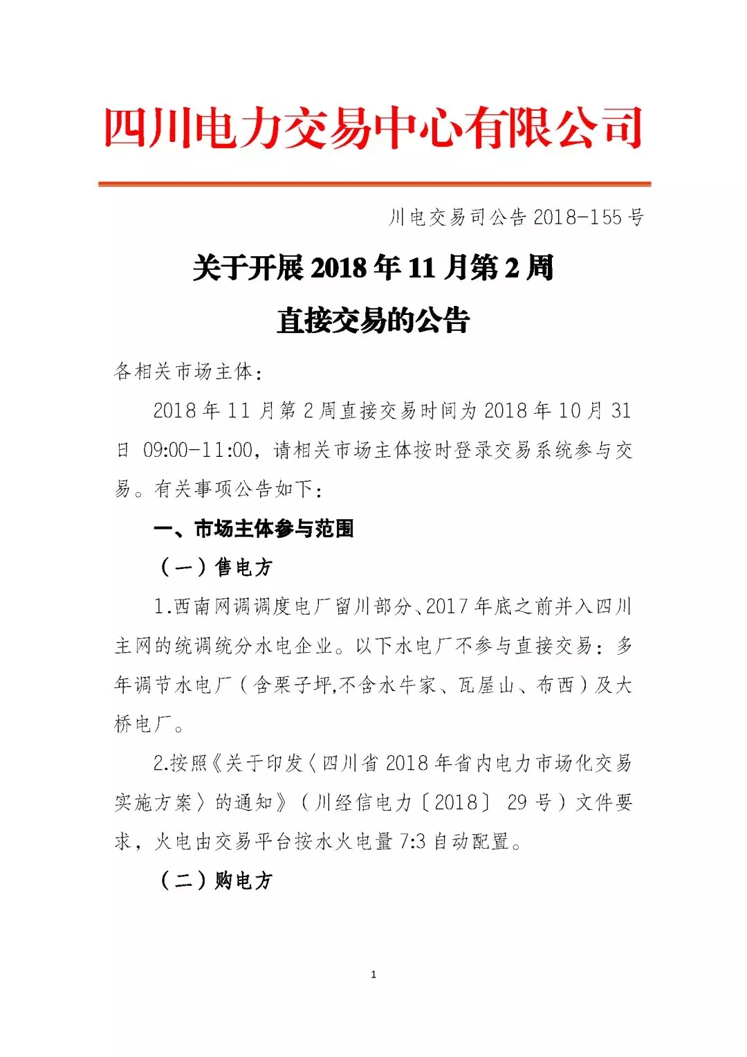公告 | 四川關(guān)于開展2018年11月第2周直接交易的公告