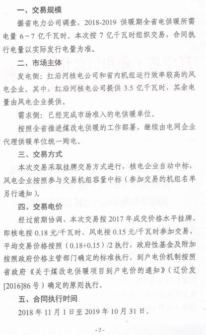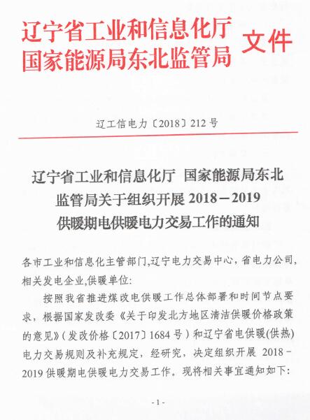 其他相關(guān)事宜按照《遼寧省工業(yè)和信息化廳國家能源局東北監(jiān)管局關(guān)于組織開展2018-2019供暖期電供暖電力交易工作的通知》(遼工信電力[2018]212號)執(zhí)行。