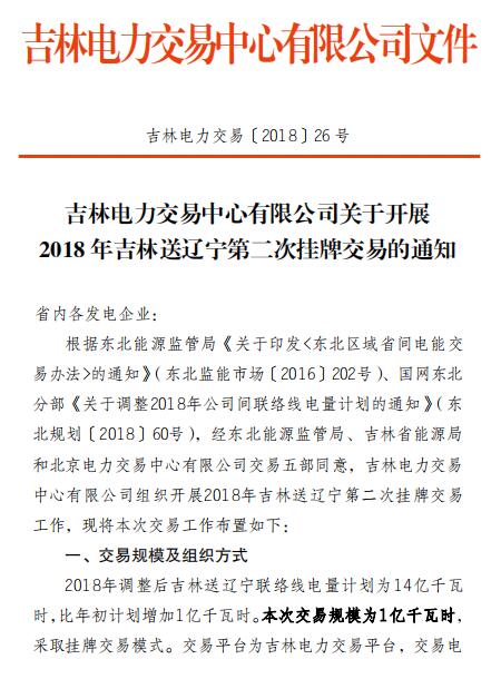 2018年吉林送遼寧第二次掛牌交易:交易規(guī)模1億千瓦時(shí)
