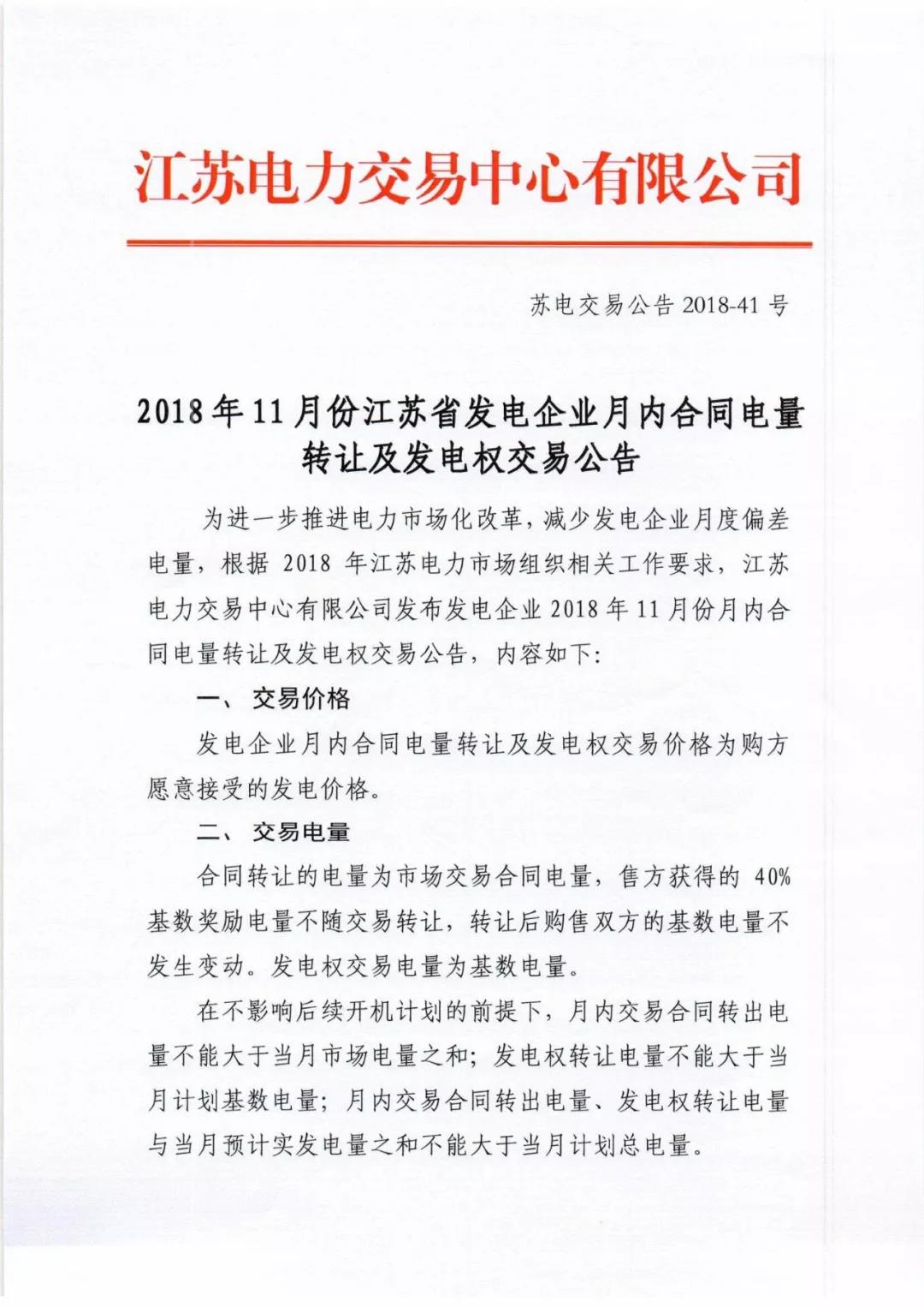 2018年11月份江蘇省發(fā)電企業(yè)月內(nèi)合同電量轉(zhuǎn)讓及發(fā)電權(quán)交易公告