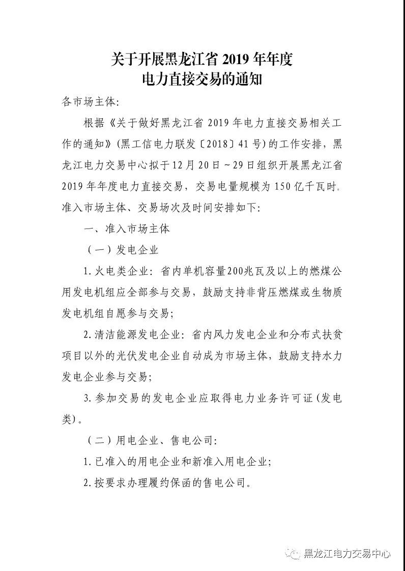 黑龍江電力交易中心日前發(fā)布了《關(guān)于開展黑龍江省2019年年度電力直接交易的通知》,交易電量規(guī)模為150億千瓦時(shí)。