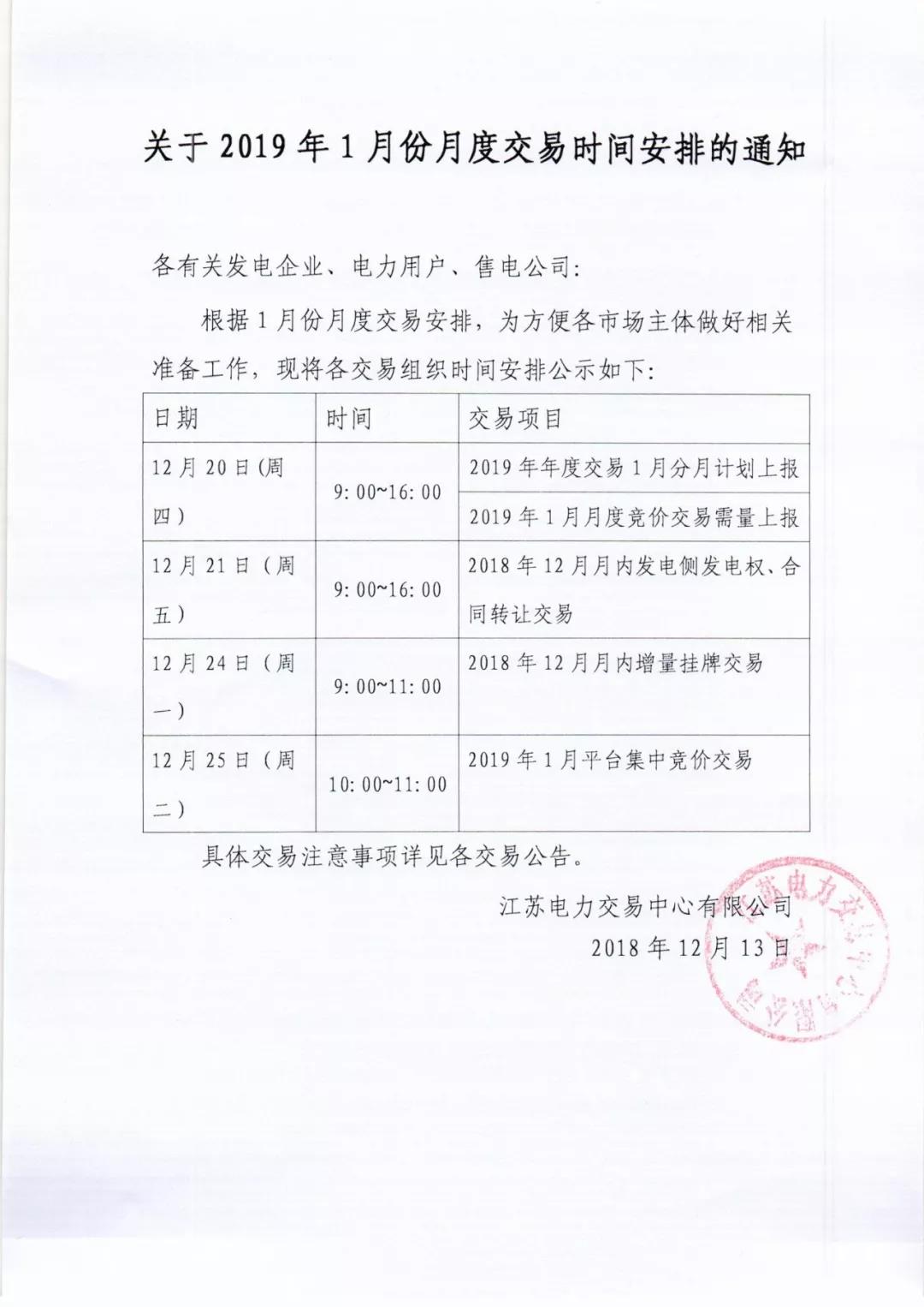 江蘇電力交易中心關于2019年1月份月度交易時間安排的通知