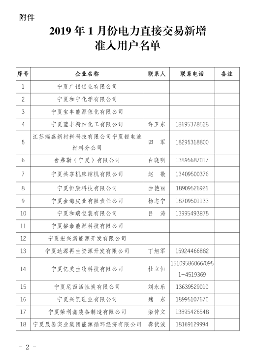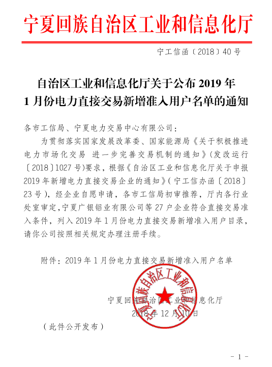 寧夏回族自治區(qū)工信廳日前公布了《2019年1月份電力直接交易新增準(zhǔn)入用戶名單的通知》