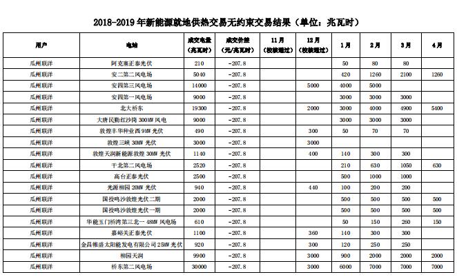 甘肅發(fā)布了《2018-2019年度甘肅省供暖示范項(xiàng)目與新能源發(fā)電企業(yè)供暖期直接交易結(jié)果公告》