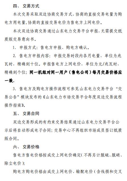 山東電力交易中心日前發(fā)布了《山東省2019年年度電力直接交易(雙邊協(xié)商)公告》,交易采取雙邊協(xié)商交易方式,協(xié)商的直接交易電量為購(gòu)電方用電量,協(xié)商的直接交易電價(jià)為售電方上網(wǎng)電價(jià)。