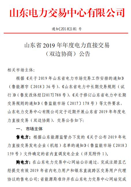 山東省2019年年度電力直接交易(雙邊協(xié)商)12月25日申報(bào)