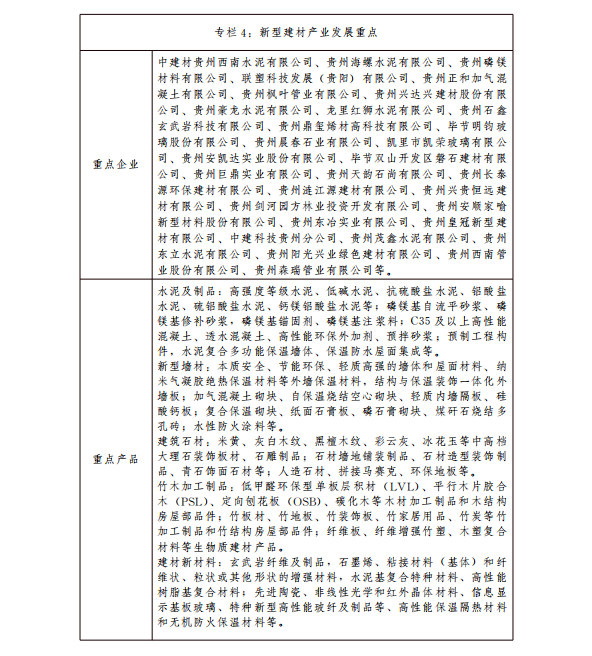 4.鼓勵發(fā)展建材新興產(chǎn)業(yè)。強化研發(fā)創(chuàng)新和招商引資力度,重點開發(fā)和引進以服務于國家重要領域的粘接材料(基體)、水泥基復合特種材料、高性能樹脂基復合材料等為代表的新型高性能復合材料;以晶體材料、信息顯示基板玻璃等特種新型玻璃、特種新型高性能玻纖及制品、玄武巖纖維產(chǎn)品等為代表的先進無機非金屬材料;以硅材料、高性能陶瓷基板、石墨負極、高性能摩擦、密封、保溫、防火材料為代表的非金屬礦物及制品等。