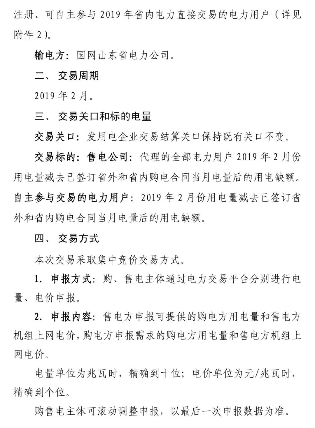 根據(jù)《關于2019年山東省電力市場交易工作安排的通知》(魯能源字〔2018〕36號)、《山東省電力中長期交易規(guī)則(試行)》(魯發(fā)改體經(jīng)〔2017〕788號)、《關于修訂山東省電力中長期交易規(guī)則的通知》(魯監(jiān)能市場〔2017〕178號)等文件要求,山東電力交易中心有限公司定于近期開展山東省2019年2月份電力直接交易(集中競價),交易公告如下: