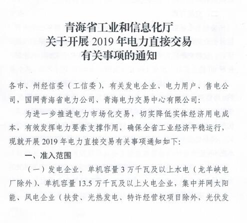 青海省工信廳發(fā)布了《關(guān)于開展2019年電力直接交易有關(guān)事項(xiàng)的通知》