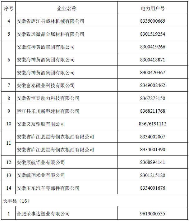 2016年12月15日,合肥市發(fā)改委向安徽電力交易中心提交了擬參與2017年直接交易電力用戶(hù)332戶(hù),并說(shuō)明其中85戶(hù)存在用戶(hù)號(hào)錯(cuò)誤等疑問(wèn)。根據(jù)有關(guān)規(guī)定,交易中心安徽電力交易中心對(duì)外公示了初審無(wú)異議的247戶(hù)用戶(hù)。2017年1月13日,合肥市發(fā)改委對(duì)存疑的85戶(hù)進(jìn)行了進(jìn)一步核實(shí)和修訂,并將符合規(guī)定的76戶(hù)企業(yè)再次報(bào)送,現(xiàn)予公示(名單附后)。