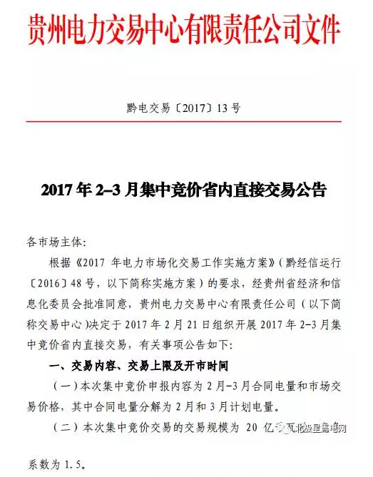 貴州2017年2-3月集中競(jìng)價(jià)省內(nèi)直接交易公告