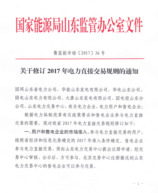 山東關(guān)于修訂2017年電力直接交易規(guī)則的通知