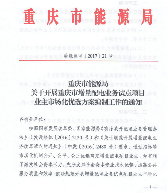 重慶市增量配電業(yè)務(wù)試點(diǎn)項(xiàng)目業(yè)主市場(chǎng)化優(yōu)選方案編制工作的通知