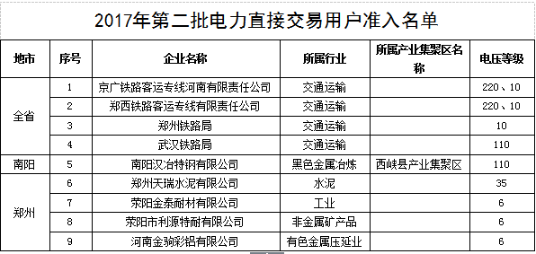 河南第二批電力直接交易用戶準(zhǔn)入名單