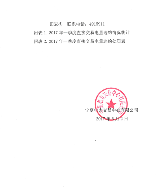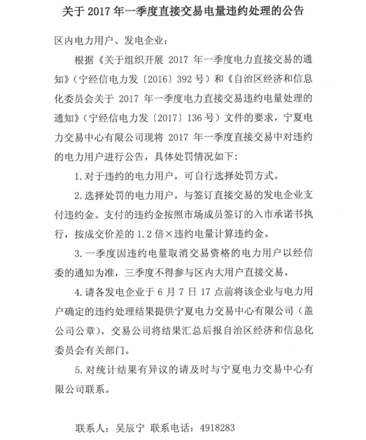 寧夏電力交易中心日前發(fā)布了《關(guān)于2017年一季度直接交易電量違約處理的公告》,公告中對一季度電力直接交易違約情況做出了處理。