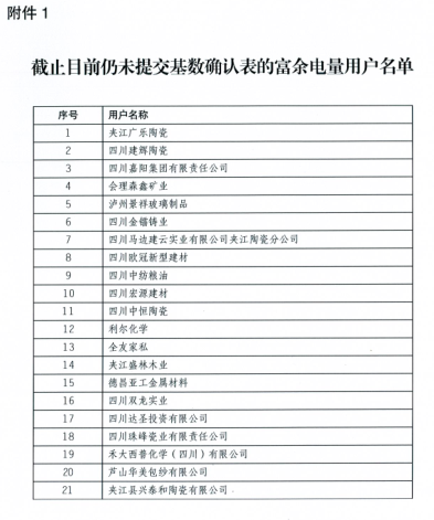 6月9日,四川電力交易中心發(fā)布了《關(guān)于2017年直購電月度及富余電量交易申報事項的再次公告》,公告中稱6月富余電量交易前,有部分申報用戶企業(yè)未能按規(guī)定及時提交屬地供電公司簽字蓋章確認(rèn)的含各月實際基數(shù)等信息的紙質(zhì)確認(rèn)依據(jù),因此未取得6月份交易資格。截止目前,仍有21家用戶未提交確認(rèn)基數(shù)。詳情如下: