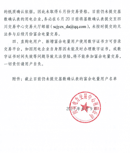 6月9日,四川電力交易中心發(fā)布了《關(guān)于2017年直購電月度及富余電量交易申報事項的再次公告》,公告中稱6月富余電量交易前,有部分申報用戶企業(yè)未能按規(guī)定及時提交屬地供電公司簽字蓋章確認(rèn)的含各月實際基數(shù)等信息