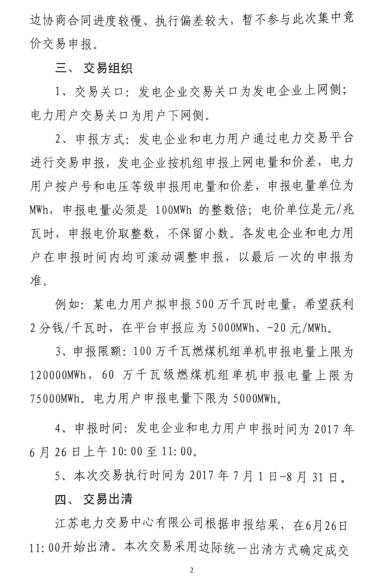 ,江蘇電力交易中心發(fā)布了《2017年7-8月份江蘇省電力集中競(jìng)價(jià)交易公告》,公告中稱,本次交易申報(bào)時(shí)間為2017年6月26日上午10:00至11:00,本次交易規(guī)模為45億千瓦時(shí)。參加交易的市場(chǎng)主體包括:(一)容量為60萬