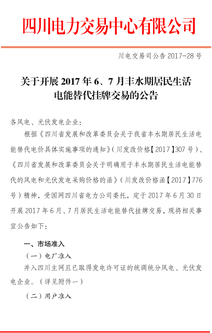 7月4日,四川電力交易中心發(fā)布《關(guān)于開(kāi)展2017 年6、7 月豐水期居民生活電能替代掛牌交易的公告》。將于7月6日上午9:00-11:30開(kāi)展6月份居民生活電能替代交易,下午14:00-16:30開(kāi)展7月份居民生活電能替代交易。