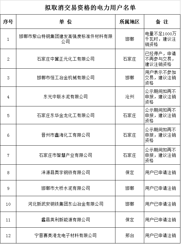 河北2018年擬參與直接交易的535家電力用戶及取消交易資格的12家電力用戶公示名單