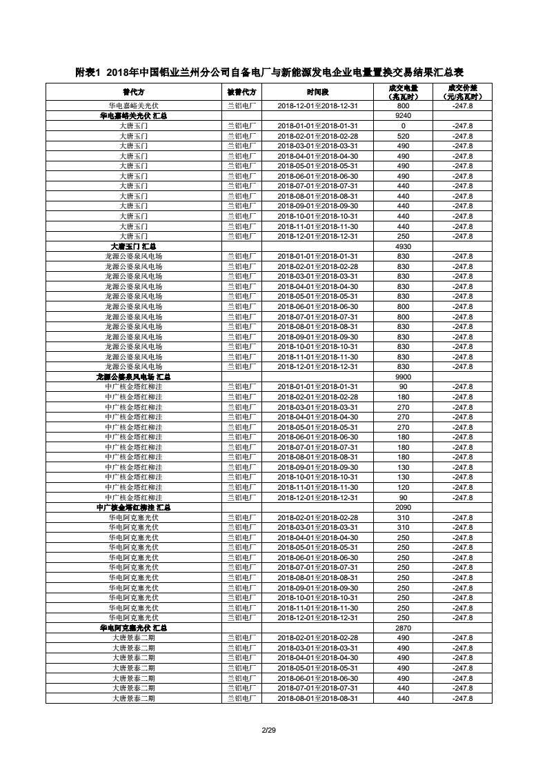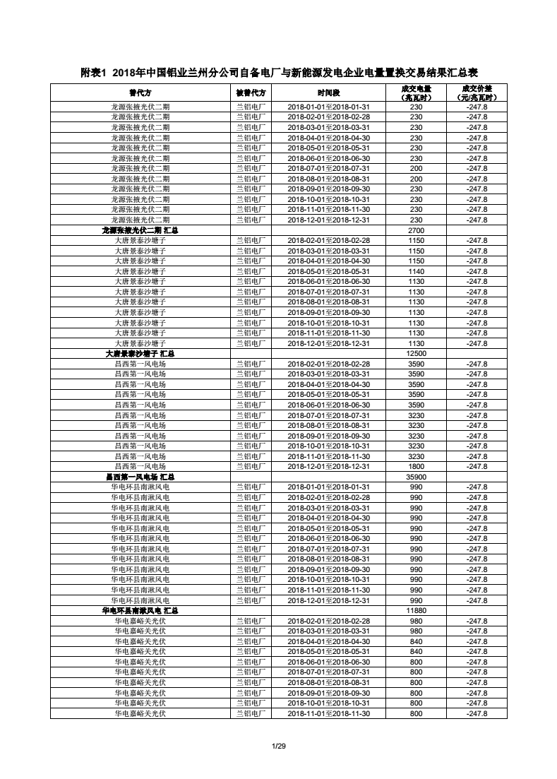 《附表1 2018年中國鋁業(yè)蘭州分公司自備電廠與新能源發(fā)電企業(yè)電量置換交易結果匯總表(18億) 》