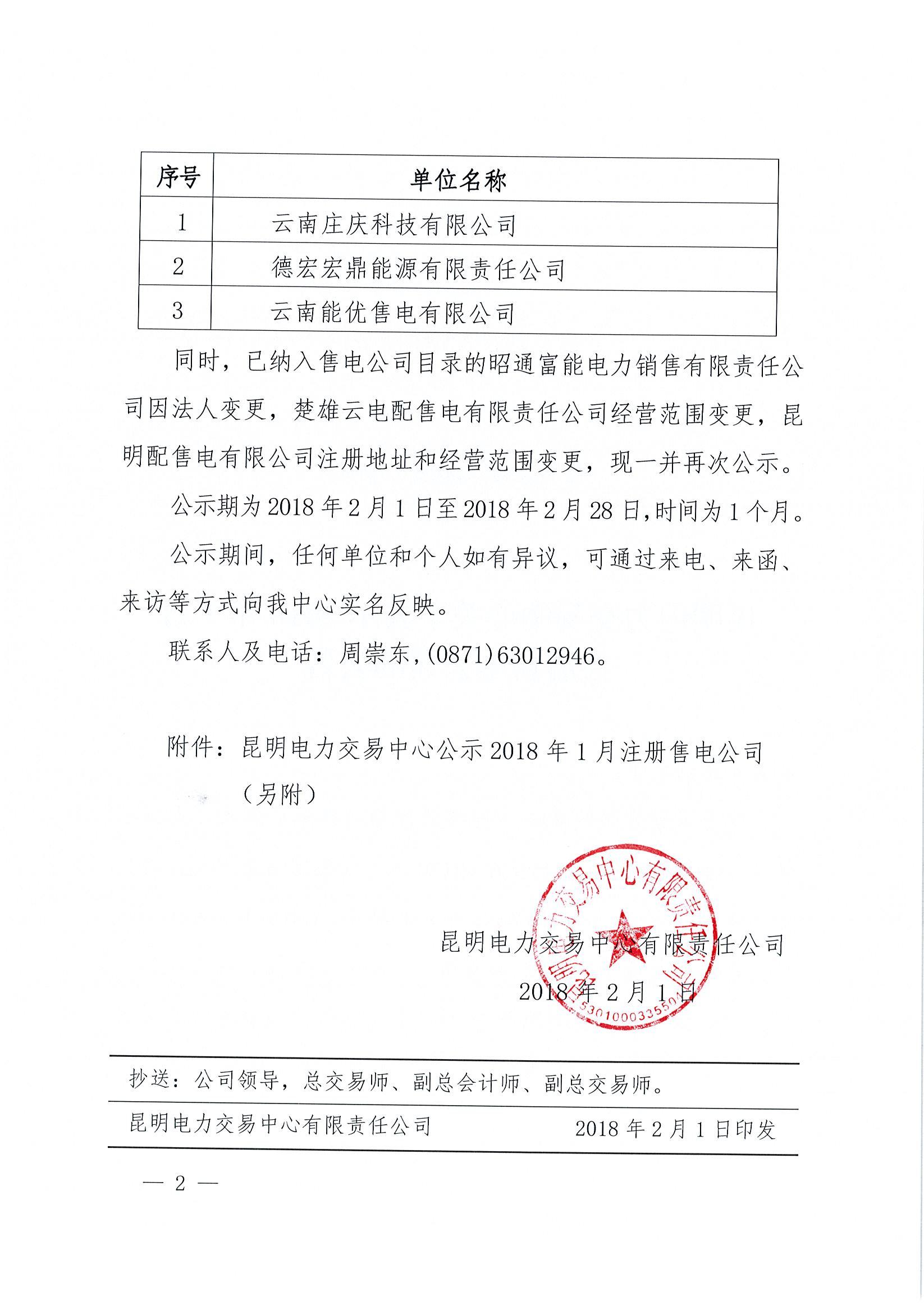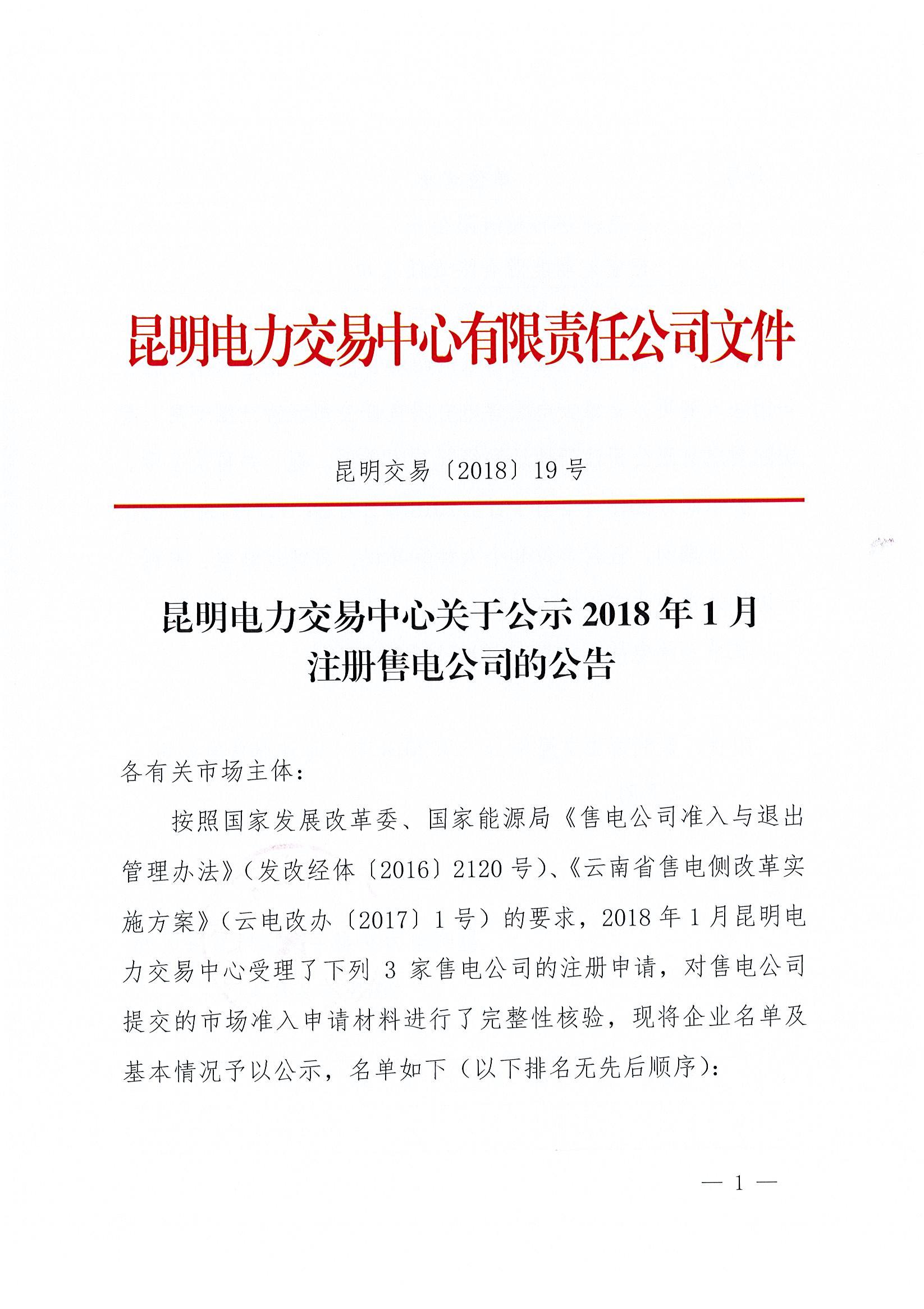 昆明電力交易中心日前發(fā)布了《關于公示2018年1月注冊售電公司的公告》,公告中包含3家售電公司,詳情如下:
