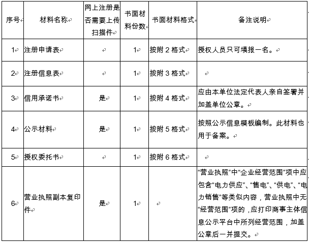 (三)已準(zhǔn)備完整的市場(chǎng)注冊(cè)資料,包括以下材料:信用承諾書、售電公司注冊(cè)申請(qǐng)表及信息表、企業(yè)基本情況說明、營業(yè)執(zhí)照、法定代表人身份證明、資產(chǎn)證明、從業(yè)人員、經(jīng)營場(chǎng)所和設(shè)備、公司章程、銀行開戶許可證、企業(yè)資質(zhì)和主要業(yè)績(jī)等基本信息、擁有配電網(wǎng)運(yùn)營權(quán)的售電公司與國家電網(wǎng)的計(jì)量點(diǎn)關(guān)口等交易信息、公示材料目錄,以及售電公司認(rèn)為有必要提供并向社會(huì)公示,以及證明公司實(shí)力、信用等級(jí)和信譽(yù)的有關(guān)證明材料,具體材料詳見《售電公司注冊(cè)材料清單及說明》(附1)。