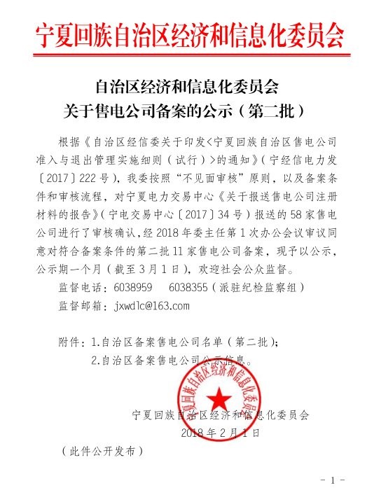 寧夏回族自治區(qū)經(jīng)信委日前發(fā)布了關(guān)于售電公司備案的公示(第二批),對符合備案條件的第二批11家售電公司備案公示,公示期一個月,詳情如下: