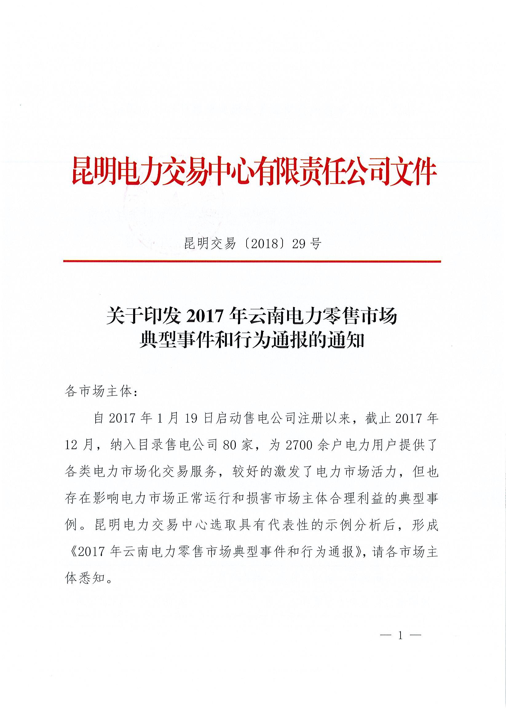 關(guān)于印發(fā)2017年云南電力零售市場(chǎng)典型事件和行為通報(bào)的通知